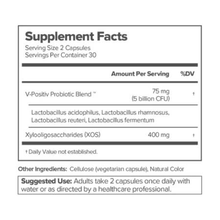 Serving Size: 2 capsules, 30 servings per container. V-Positiv Probiotic Blend™: Lactobacillus acidophilus, Lactobacillus rhamnosus, Lactobacillus reuteri, Lactobacillus fermentum 50 mg (5 Billion CFUs), Xylooligosaccharides (XOS) 400 mg